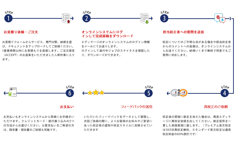 エディテージはご依頼管理にオンラインシステムを採用。お客様は世界中のどこからでも原稿のご依頼・受け取り、お支払い手続きや請求書のご依頼、校正者への質問などが簡単にできます。